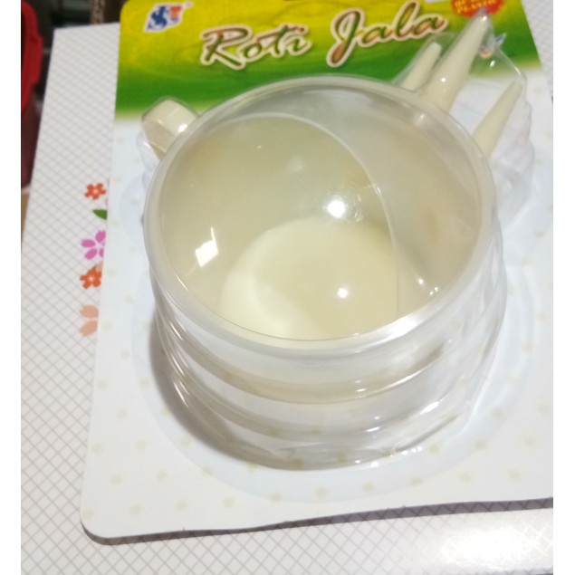 Acuan roti jala. Roti jala ni sebenarnya macam lempeng cuma ia dibentuk seperti jala yang nipis lembut dan gebu. Berikut adalah cara paling mudah membuat roti jala tanpa menggunakan acuan. Sekarang ni dah banyak jual dekat kedai plastik atau pasar raya memang senang menjala sebab picit je atas kuali leper. Masukkan adunan roti jalan ke dalam acuan.