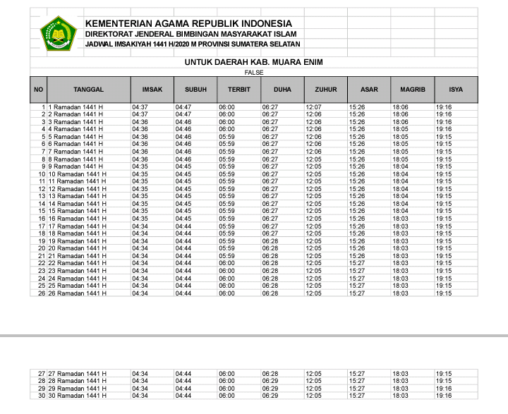 Jadwal Imsak Dan Berbuka Puasa Untuk Wilayah Kab Muara Enim 1441 H 2020 M