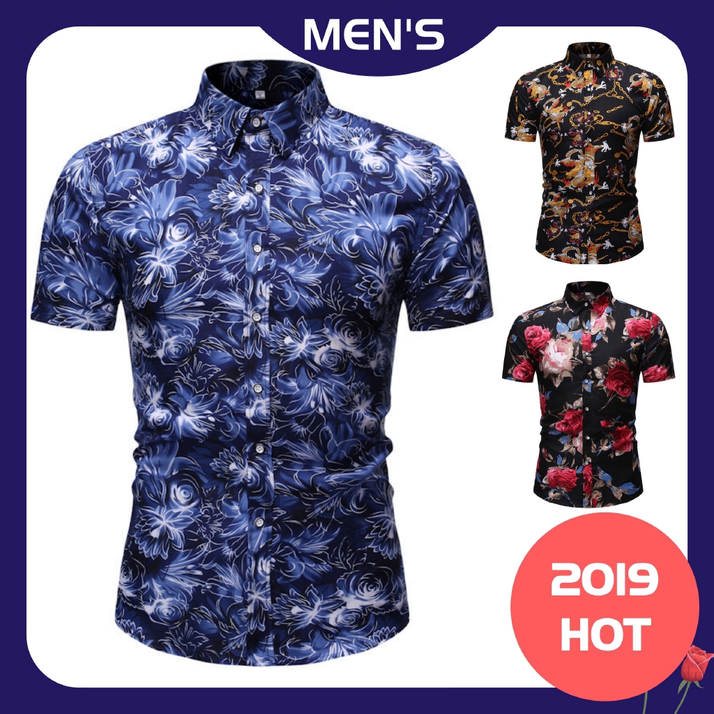 15 Colors Men S Shirt Short Sleeve Men Kemeja Batik Floral Print Lelaki Baju Slim Fit Casual Shopee Indonesia
