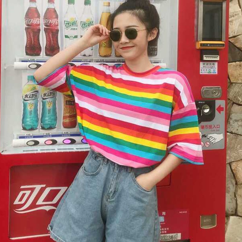 Ins Kaos T Shirt Lengan Setengah Motif Garis Warna Pelangi Kontras Untuk Wanita Di Lapak Budi Bukalapak