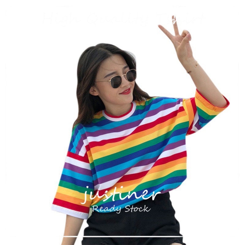 Bayar Di Tempat Kaos T Shirt Lengan Setengah Motif Garis Warna Pelangi Shopee Indonesia