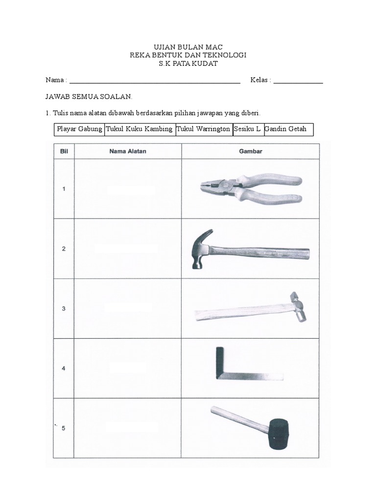 Namakan dan nyatakan fungsi alatan ini. Saiz lazim antara 5 kg hingga 0 6 kg. Tukul atau penukul ialah alat yang digunakan untuk mengetuk sesuatu. Mempunyai pemegang yang diperbuat daripada kayu atau besi dan bahagian bongkolnya bengkok dan terbelah.